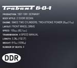 Trabant ist eine in der DDR beim VEB Sachsenring Automobilwerke in Zwickau hergestellte Pkw-Marke. Das Modell 601 kam 1964 auf den Markt und wurde bis 1990 produziert. In Trabant-Autos kamen mehrere technisch interessante Lösungen zum Einsatz. Das waren unter anderem Körper aus Kunststoff namens Duroplast. Es hatte einen ähnlichen Schmelzpunkt wie Aluminium und erhöhte die Korrosions- und Druckbeständigkeit des Autos. Andere bemerkenswerte Lösungen sind ein kleiner Zweitaktmotor, große Fenster und ein relativ geräumiger Innenraum. Das Auto entwickelte eine schwindelerregende Geschwindigkeit von etwas über 100km/h.
