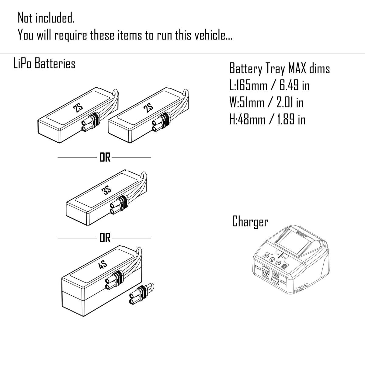 *Maximale Akkuabmessungen 6.14x2.01x1.89 in (156x51x48mm). Minimale Batteriespezifikationen 5000mAh 35C.