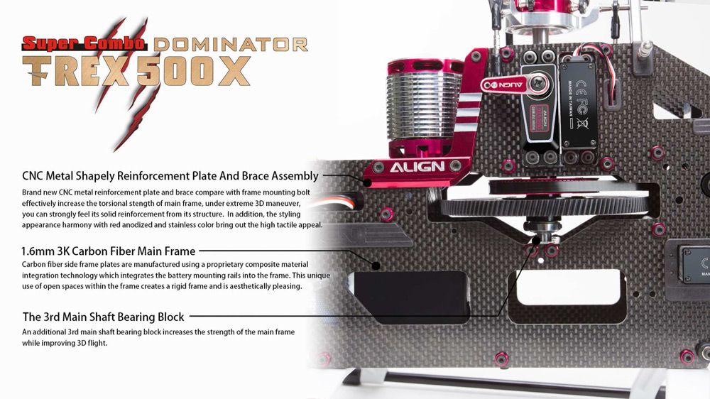 The brand new low CG 500EFL Flybarless Rotor Head System utilizes the precision grinding of high-carbon steel hollow shaft effectively increase its concentricity. Allow to reduce resistance during 3D maneuvers, increased flight reponsiveness and precision. In addition, the style appearance harmony with red anodized and stainless color, bring out the high quality just like 700 size 3D helicopter.