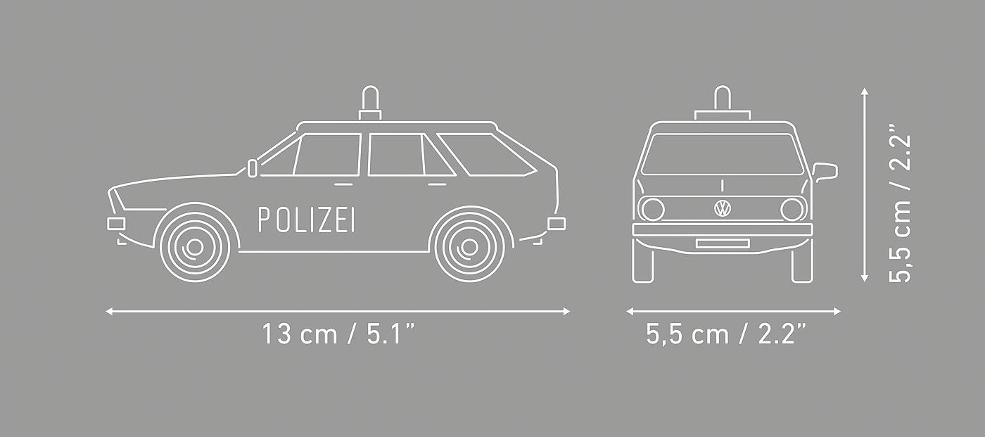 Perfect replica of the silhouette - the model reflects the proportions and appearance of the classic police station wagon of the 1970s: a sleek roofline, a massive rear end, large windows and the characteristic side line familiar from many police service vehicles. Every element has been designed with authenticity in mind, including the characteristic service livery.