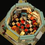 The flying saucer and restaurant roof can be quickly removed to reveal the interior. The base plate can be removed and laid flat 180 degrees. The interior decorations can be taken apart individually and freely combined.