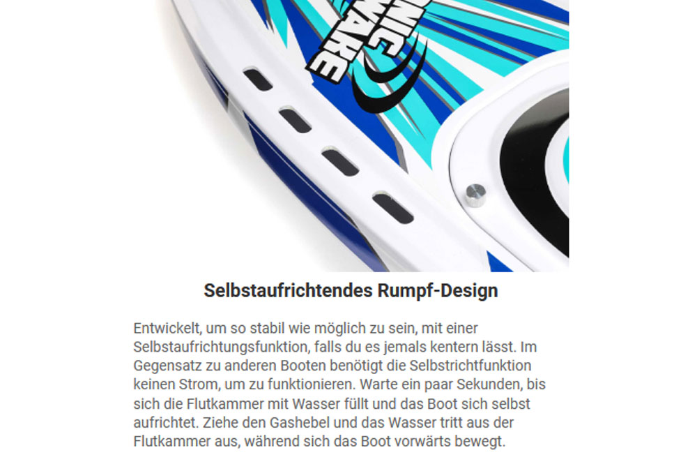 Breche Wellen und pflüge mit Vollgas durch unruhiges Wasser - mit dem Pro Boat® Sonicwake 36-Zoll Self-Righting Deep-V. Das perfekte Deep-V, für den Anfänger als auch den begeisterten Bootsfahrer, bietet Leistung, erreicht 80+ kmh Spitze, und verfügt über eine sorgenfreie Self-Rightening Funktion, die das Boot in Sekundenschnelle wieder aufrichtet. Der wassergekühlte 4-polige brushless 1900-kV-Motor lädt dich ein, schnell zu fahren, während das drehmomentstarke wasserdichte Lenkservo mit Metallgetriebe dir jederzeit die volle Kontrolle garantiert. Das Sonicwake verfügt über eine verbesserte duale Wasserkühlung, verstellbare Trimmklappen und größere Wendeflossen. Unabhängig von deinem Können bietet das Sonicwake alles, was Experten und Anfänger gleichermaßen von einem Deep-V erwarten.