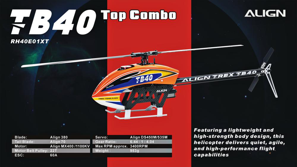 The TB40 Top Combo is a versatile complete package, ideal for all flight styles including extreme 3D, with a clear focus on performance and stability. Featuring an efficient belt-drive system, durable composite side frames with patented embedding technology, a streamlined canopy, and improved mounting, this model offers an exceptionally light, quiet, and agile flying experience.
