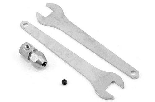 Collet-style motor coupler with 4x3 stainless grub screw with applied threadlock and 10 mm wrenches (2)