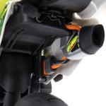 Die Positionierung der Promoto-SM-Sturzbügel wurde aktualisiert, sodass größere Neigungswinkel möglich sind, als bei dem Motorcross-Gegenstück. Neue Sturzbügelrollen, auf Lagern montiert, reduzieren Geräusche und bieten bessere Traktion auf harten Oberflächen. Einstellbare Anschläge zum Einstellen nach oben und unten sind enthalten, sodass du das Motorrad für jede Oberfläche und jedes Gripniveau abstimmen kannst. Die Sturzbügel helfen oft auch beim Aufrichten nach einem Crash, wenn der Hinterreifen noch Traktion hat. Wenn das Bike auf der Strecke liegt, ziehe einfach den Gashebel, um es aufzurichten und dein Rennen fortzusetzen.