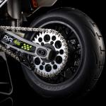 Wir könnten das Promoto-SM nicht als Supermoto bezeichnen, wenn es keinen Kettenantrieb gäbe. Stahlglieder und 70 Rollenbolzen umschließen ein 10-Zahn-Stahl-Ritzel und ein 36-Zahn-Aluminium-Kettenrad. Unabhängig von den Bedingungen treibt der Kettenantrieb den Hinterreifen effizient und zuverlässig an.
