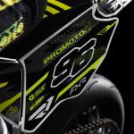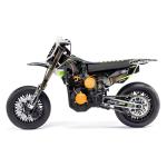 Ob groß oder klein, kein Supermoto würde ohne einen richtig beklebten Verkleidungsteilesatz gut aussehen. Beim Promoto-SM ist alles vorhanden - vorderes Schutzblech, Startnummerntafel, Gabelprotektoren, vordere Seitenverkleidung, hintere Seitenverkleidung und ein hinteres Schutzblech - alles kommt frisch verpackt mit offiziell lizenzierter Vinylbeklebung - aber äußerst langlebig.