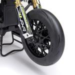 Wenn 3,6kg mit hoher Geschwindigkeit über die Strecke rasen, ist eine ziemlich steife Servo-Saver-Feder erforderlich, um das Promoto-SM sicher in die nächste Kurve zu führen. Wie bei allem, was stark gefedert ist, lässt sich eine starke Feder am besten kontrollieren, wenn man die Bewegung dämpft. Eine wichtige Entwicklung der Promoto-Plattform ist eine mit Flüssigkeit gefüllte Dämpferkammer zwischen dem oberen und unteren Lenkkopflager. Die Kammer ist mit 500.000cSt gefüllt, was gute Dämpfungseigenschaften für den Servo-Saver ermöglicht und auch dabei hilft, mögliches "e;Lenkerflattern" zu kontrollieren.