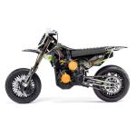 Ob groß oder klein, kein Supermoto würde ohne einen richtig beklebten Verkleidungsteilesatz gut aussehen. Beim Promoto-SM ist alles vorhanden – vorderes Schutzblech, Startnummerntafel, Gabelprotektoren, vordere Seitenverkleidung, hintere Seitenverkleidung und ein hinteres Schutzblech – alles kommt frisch verpackt mit offiziell lizenzierter Vinylbeklebung aber äußerst langlebig.