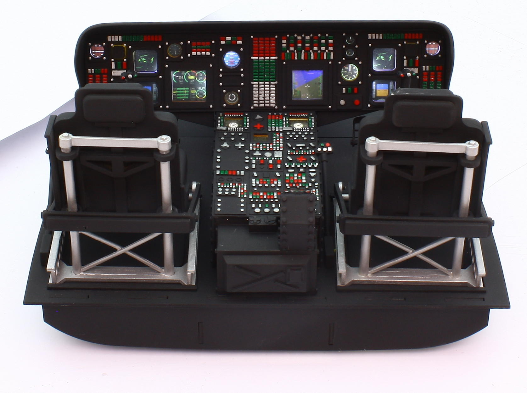 Dieses Kit enthält ein voll ausgestattetes, beleuchtetes Cockpit mit Armaturenbrett, Steuerknüppeln, Pedalen, Antennen, Scheibenwischern und mehr. Die vollständige Innenraumgestaltung der hinteren Kabine ist enthalten (nicht installiert). Boden- und Deckenverkleidungen können gestaltet werden, sodass das Interieur nach der Installation ein beeindruckend maßstabsgetreues Cockpit ergibt.