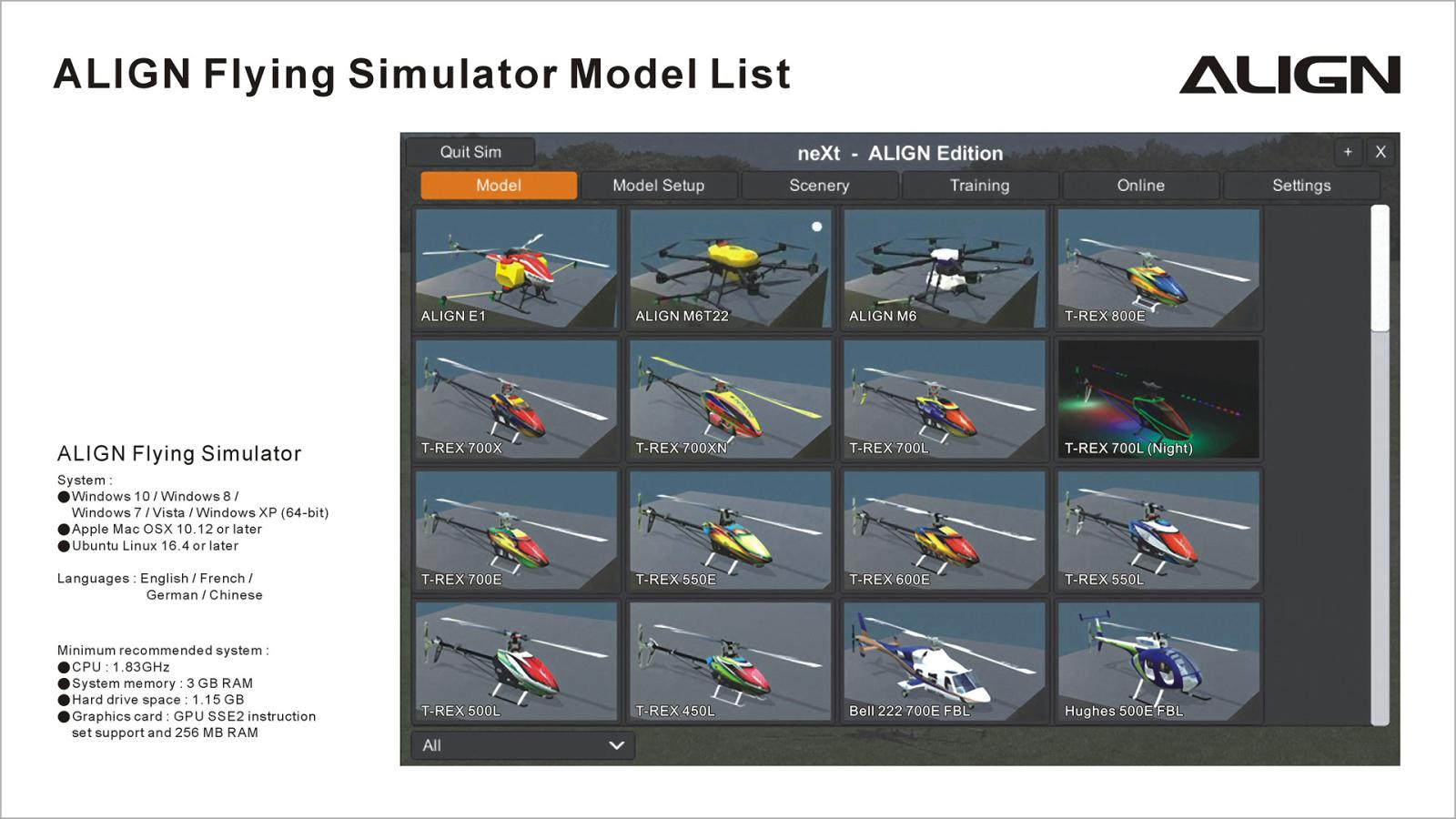 ALIGN Flying Simulator enthält ALIGN E1, T-REX Helikopter, Scale-Hubschrauber, Multikopter, Racing Quad und auch Starrflügelmodelle.
