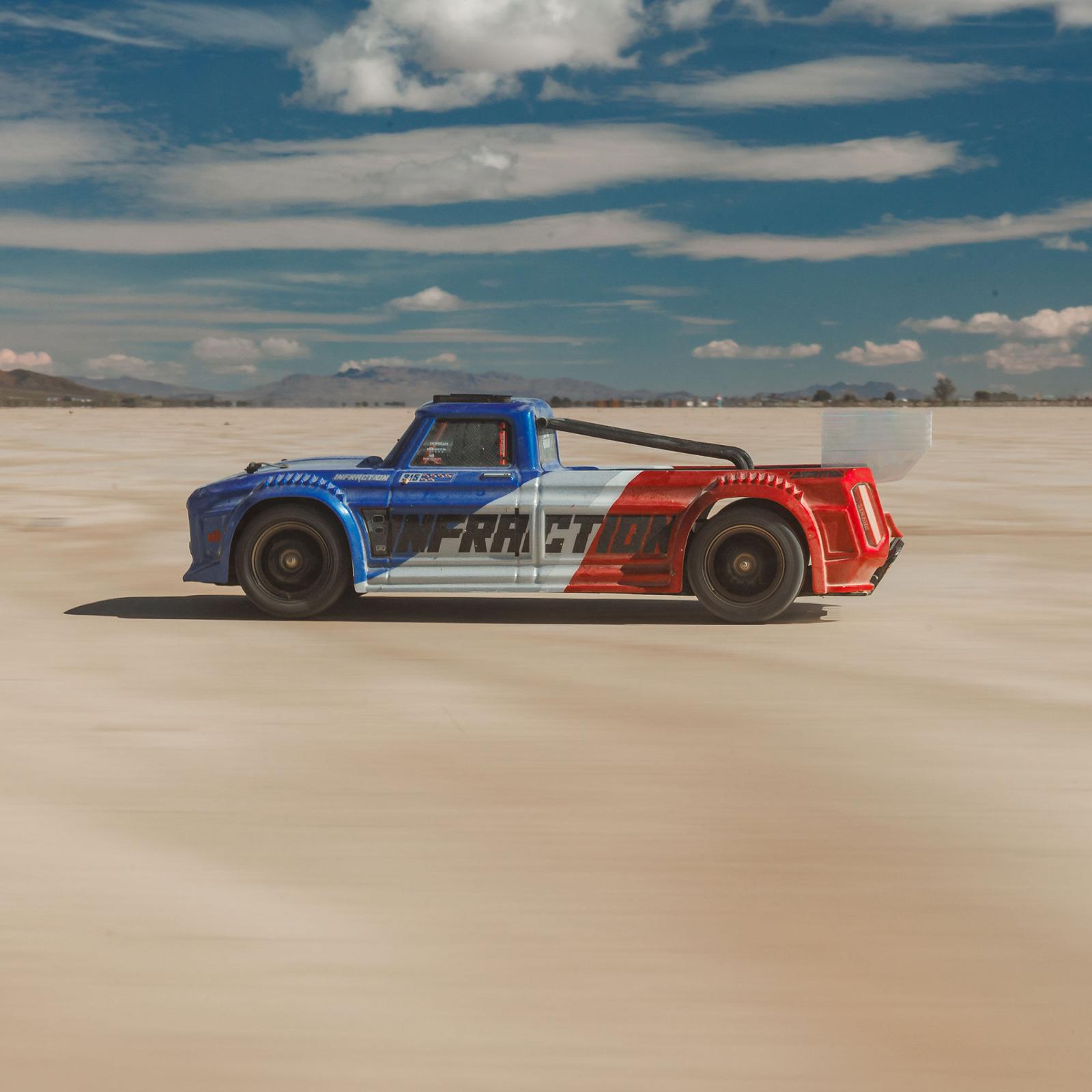 Der ARRMA INFRACTION™ 223S BLX DSC 4X4 RTR ist eine umfassende Weiterentwicklung, die Geschwindigkeiten von über 105+ km/h (65+ MPH) kontrollierbarer und den INFRACTION außerdem zugänglicher und robuster macht als je zuvor.