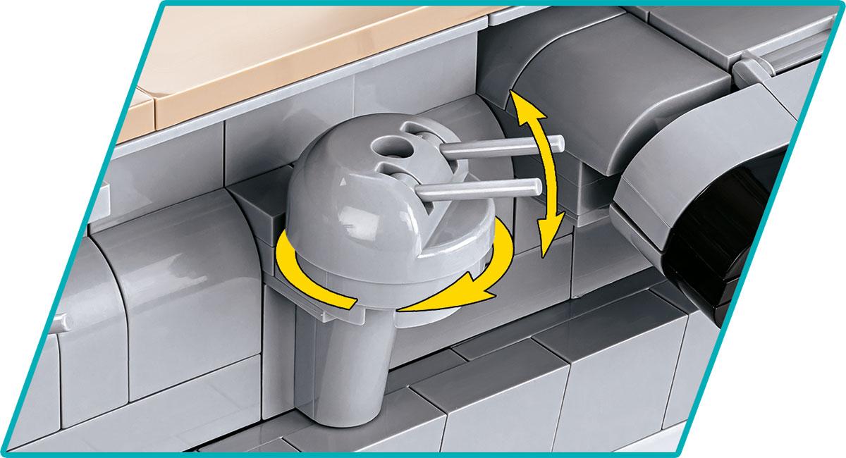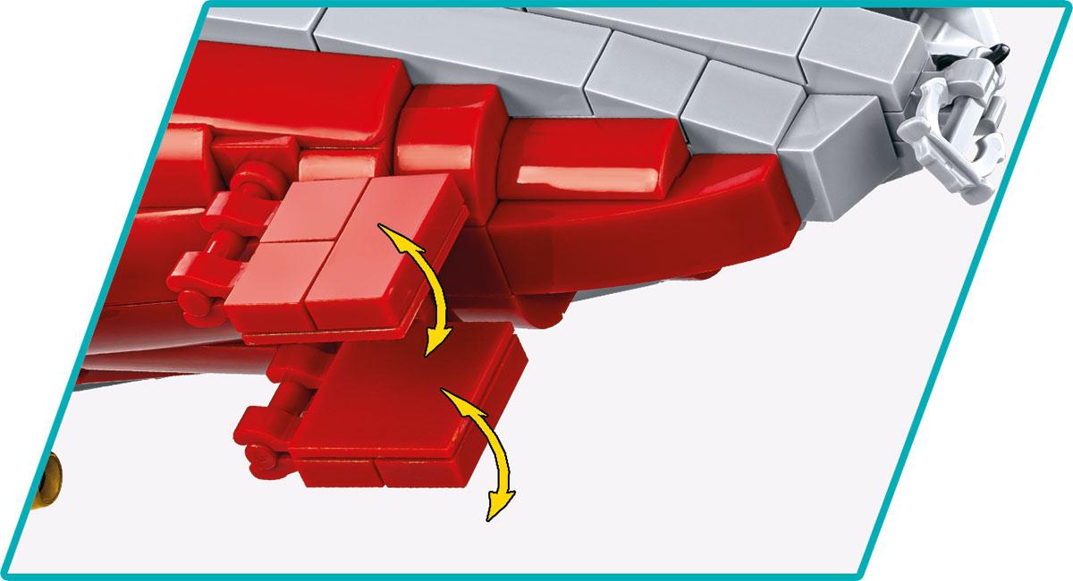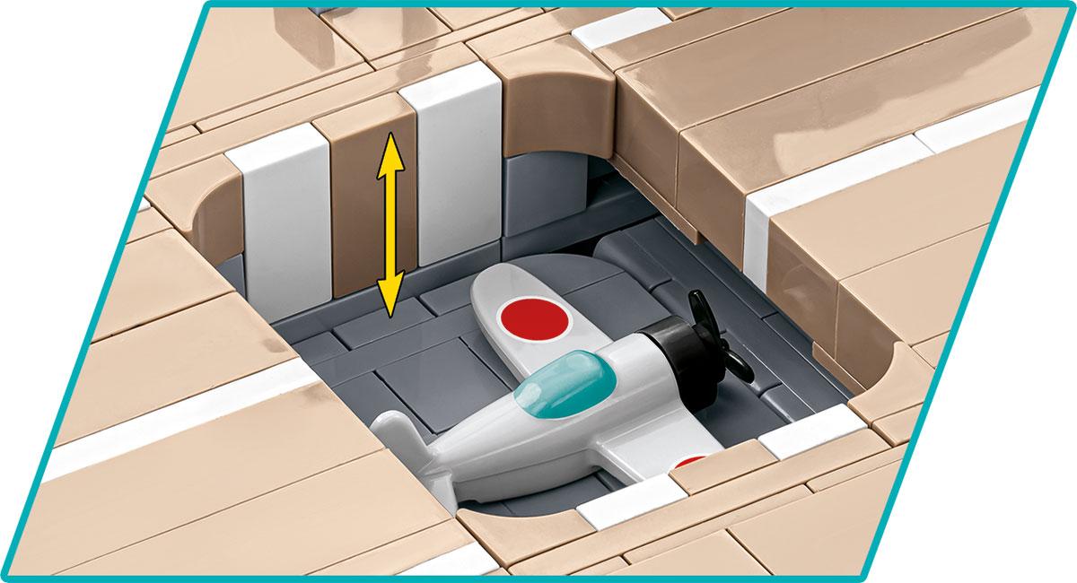 Das von COBI erstellte Schiffsmodell wurde im Maßstab 1:300 hergestellt. Es besteht aus 3.573 Elementen und ist 87 cm lang. Dank der Verwendung neuester verfügbarer Elemente und fortschrittlicher Bautechniken spiegelt das Modell die Proportionen des historischen Schiffes so originalgetreu wie möglich wider und behält alle wichtigen Elemente bei. Eine sehr interessante Designlösung sind zwei bewegliche Flugzeugaufzüge, die wir anheben und absenken können. Der Akagi-Flugzeugträger verfügt über zahlreiche bewegliche Teile wie Propeller, Ruder, rotierende Geschütztürme und Kanonenrohre, die angehoben und abgesenkt werden können. Auf dem Deck des Flugzeugträgers können wir 5 bunte Miniflugzeuge mit Aufdrucken platzieren, die im Set enthalten sind! Das Set enthält außerdem einen sehr stabilen und ästhetischen schwarzen Ausstellungsständer mit einem Schild, auf dem der Name und der Maßstab des Schiffes aufgedruckt sind.