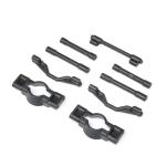 This Cross Bar Chassis Brace Set includes shock tower crossbars, body mount crossbar shock tower plates, upper link crossbars, a cage crossbar, and hoop crossbar.