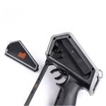 Es gibt keine externe Antenne, die abgeschert werden könnte - eine kleine Beule im Gehäuse schützt das Hochgeschwindigkeits-Ausgangssignal. Ein vielseitiger Gehäuseschutz auf der Vorderseite erhöht die Haltbarkeit weiter und bietet zudem die Möglichkeit, eine Kamera, eine Lichtquelle oder andere Geräte anzubringen. An den beiden Befestigungspunkten können Sie einen Trageriemen anbringen, so dass Sie den Sender in der Hand haben, aber beide Hände frei haben, wenn Sie nicht fahren. In einem leicht zugänglichen Fach können Sie einige kleine Werkzeuge, wie z. B. einen T-Schlüssel, aufbewahren, die Sie einfach einrasten lassen können. Wir haben auch die Wasserabweisung* des Senders verbessert, um Ihnen etwas mehr Spielraum zu geben, falls Sie doch einmal einen Spritzer oder ein paar Regentropfen auf das System abbekommen. Um das Ganze abzurunden, haben wir ein aggressives Lenkrad im Offroad-Stil mit einem innovativen Daumenhebel hinzugefügt, der die einhändige Steuerung Ihres Fahrzeugs sicherer und präziser macht.
