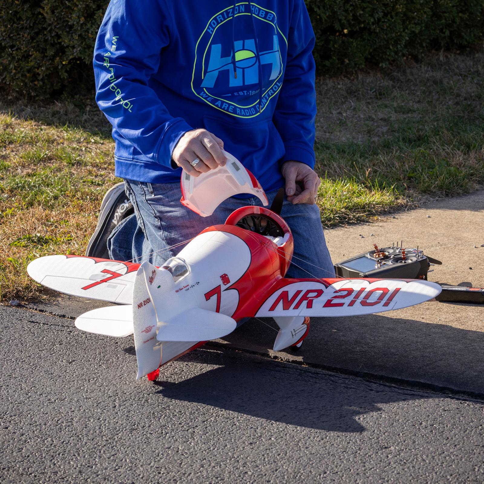 Kein Kleber oder spezielles Werkzeug ist für die Endmontage erforderlich, sodass der Gee Bee R-2 1,0 m schneller flugbereit ist, als ein Akku zum Laden braucht! Dank seiner praktischen Größe passt er zudem vollständig montiert in fast jedes Fahrzeug, was den Transport und die Aufbewahrung extrem einfach macht.