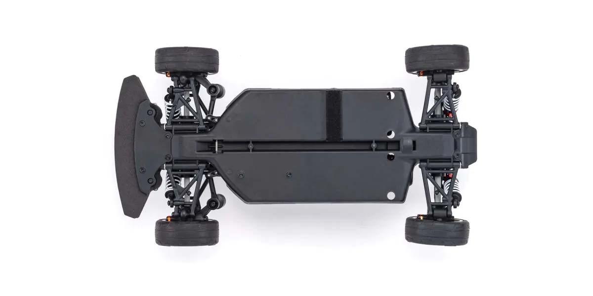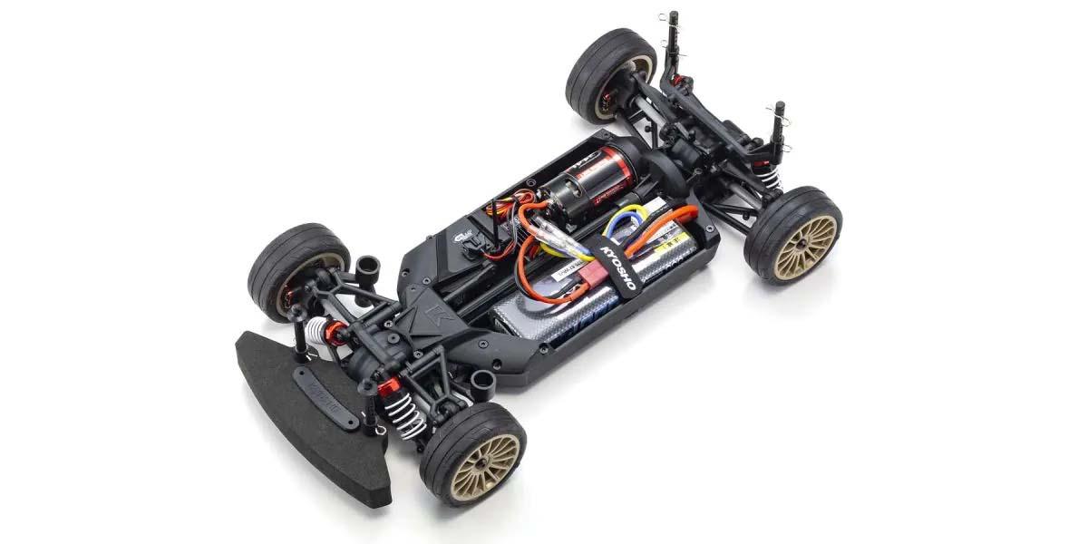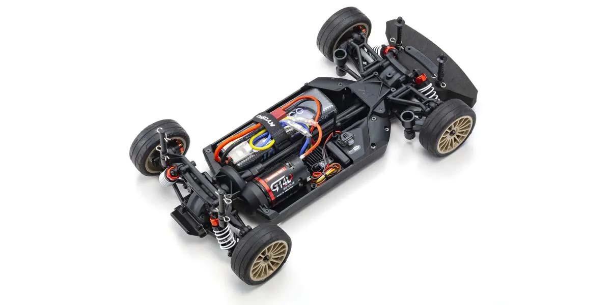 Für den reinen Fahrspaß ist die Kombination aus einer wunderschön nachgebildeten Karosserie und dem Chassis der FAZER-Serie unschlagbar. Kyosho hat sein Standard-Tourenwagen-Chassis genommen und es einer kompletten Modellüberarbeitung unterzogen, die die Leistung auf ein neues Niveau gebracht hat. Ein vereinfachtes Design mit weniger Teilen hat die Wartungseffizienz verbessert und das Gewicht reduziert, während die Festigkeit und Steifigkeit des Kerns durch neue Materialien, Verrippungen und Versteifungen an Front und Heck erhöht wurde. Darüber hinaus sorgt das symmetrische Chassisdesign für eine hervorragende Balance zwischen Vorder- und Hinterachse und eine reaktionsschnelle Kontrolle, unabhängig von der Antriebsquelle. Ausgestattet mit einer Rutschkupplung, Differentialen vorne und hinten, Öldruckstoßdämpfern und Kugellagern, ermöglicht die hohe Haltbarkeit und Stoßfestigkeit dem Fahrer, das volle Potenzial des Fahrwerks auszuschöpfen. Bremsscheiben-Radnaben mit zwei verschiedenen Einpresstiefen (0mm, +5mm) sorgen für Kompatibilität mit 190mm und 200mm breiten Karosserievarianten und ermöglichen es, den Radstand auf 274mm zu verstellen, indem einige Teile (separat erhältlich) ausgetauscht werden, um die Kompatibilität mit anderen 1/10 Karosserievarianten zu gewährleisten. Das Readyset-Paket wird komplett montiert geliefert und enthält alles außer Ladegerät und Akku für das Chassis und Batterien für den Sender.