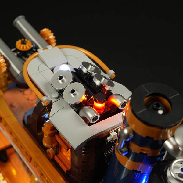 Dies ist kein statisches Modell. Wenn Sie das Schiff auf seinen versteckten Rädern vorwärts schieben, drehen sich die Schaufelräder realistisch und der Auspuff des Schornsteins erwacht zum Leben. Zusammen mit einem drehbaren Steuerrad, einem Anker, der ins Wasser fällt, und sich öffnenden Luken entsteht so ein fesselndes, interaktives Steampunk-Erlebnis.