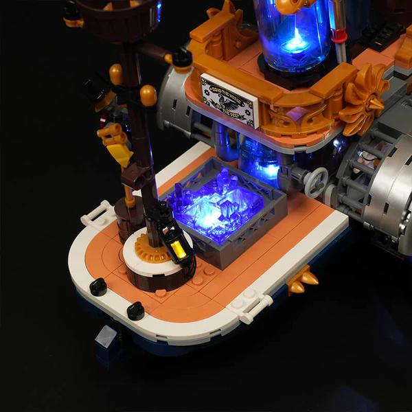 Warme Lampen im viktorianischen Stil verschmelzen mit dem tiefblauen und violetten Schimmer der Meeresoberfläche. Die sich drehenden Schiffsräder strahlen ein sanftes Licht aus und erschaffen so gemeinsam eine fantastische Reise, die die Vergangenheit mit einer futuristischen Vision verbindet.