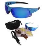 Neben den blau gefärbten verspiegelten Gläsern sind noch 1 polarisierendes braunes Gläserpaar und ein gelbes dabei.