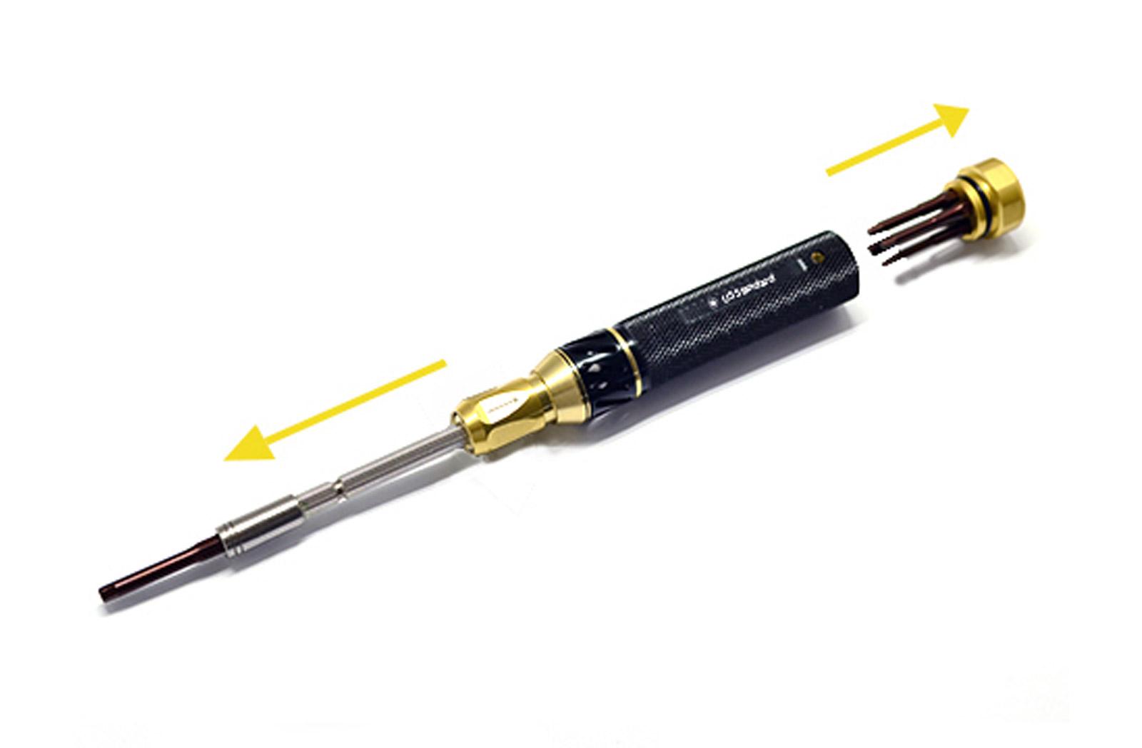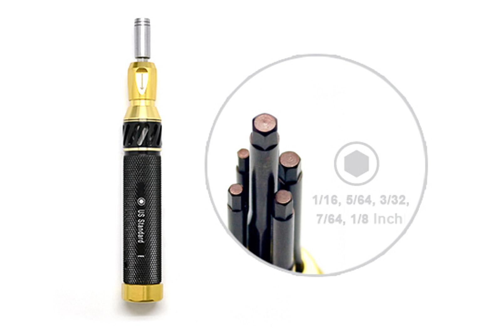 Dank des Hollow Core Designs und der gerändelten Griffoberfläche von Scorpion erhalten Sie ein ultraleichtes Werkzeug mit hervorragendem Grip und angenehmem Handling. Wenn Sie die obere Kappe abnehmen, erhalten Sie Zugriff auf den Halter für die 5 Werkzeugspitzen und können die gehärteten Stahl-Innensechskant-Bits passend zur jeweiligen Schraubengröße auswählen. Perfekt für die Fernsteuerungstasche oder die Werkzeugtasche am Flugfeld.